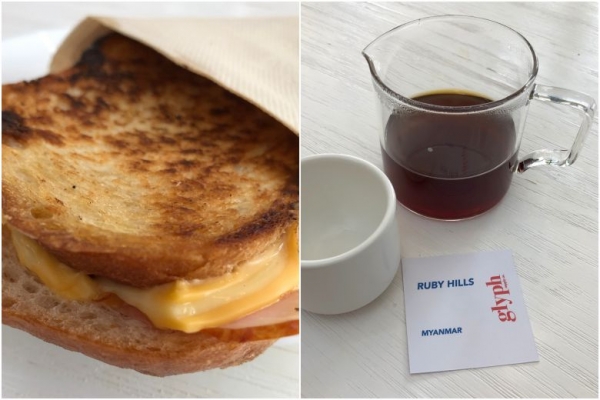 Ruby Hills from Myanmar coffee and grilled cheese sandwich with cheddar, mozarella and ham from Glyph Supply Co.