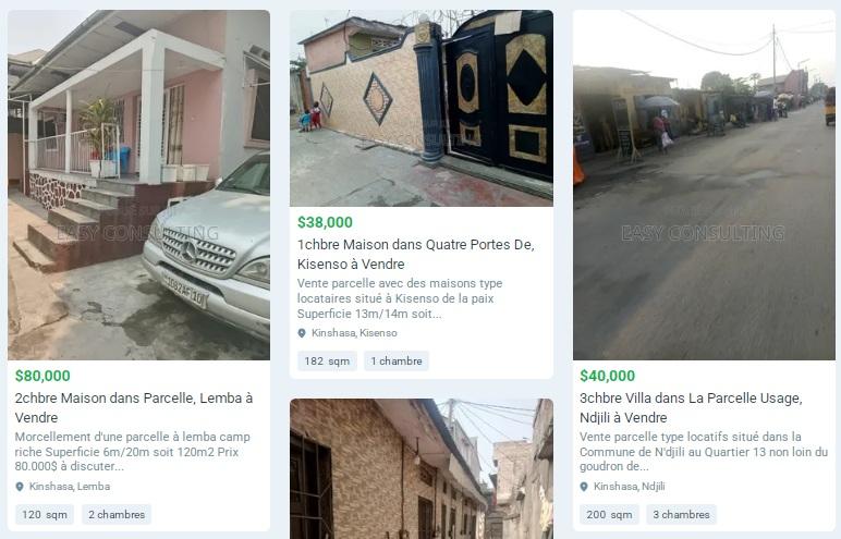 - Apartment in Kinshasa: “For sale: 3-bedroom apartment in the city center. 120 sqm, 2 floors, with parking and Congo River view. Price: $120,000. Contact: +243 123 456 789.” (Photos: Modern interior with furniture.)